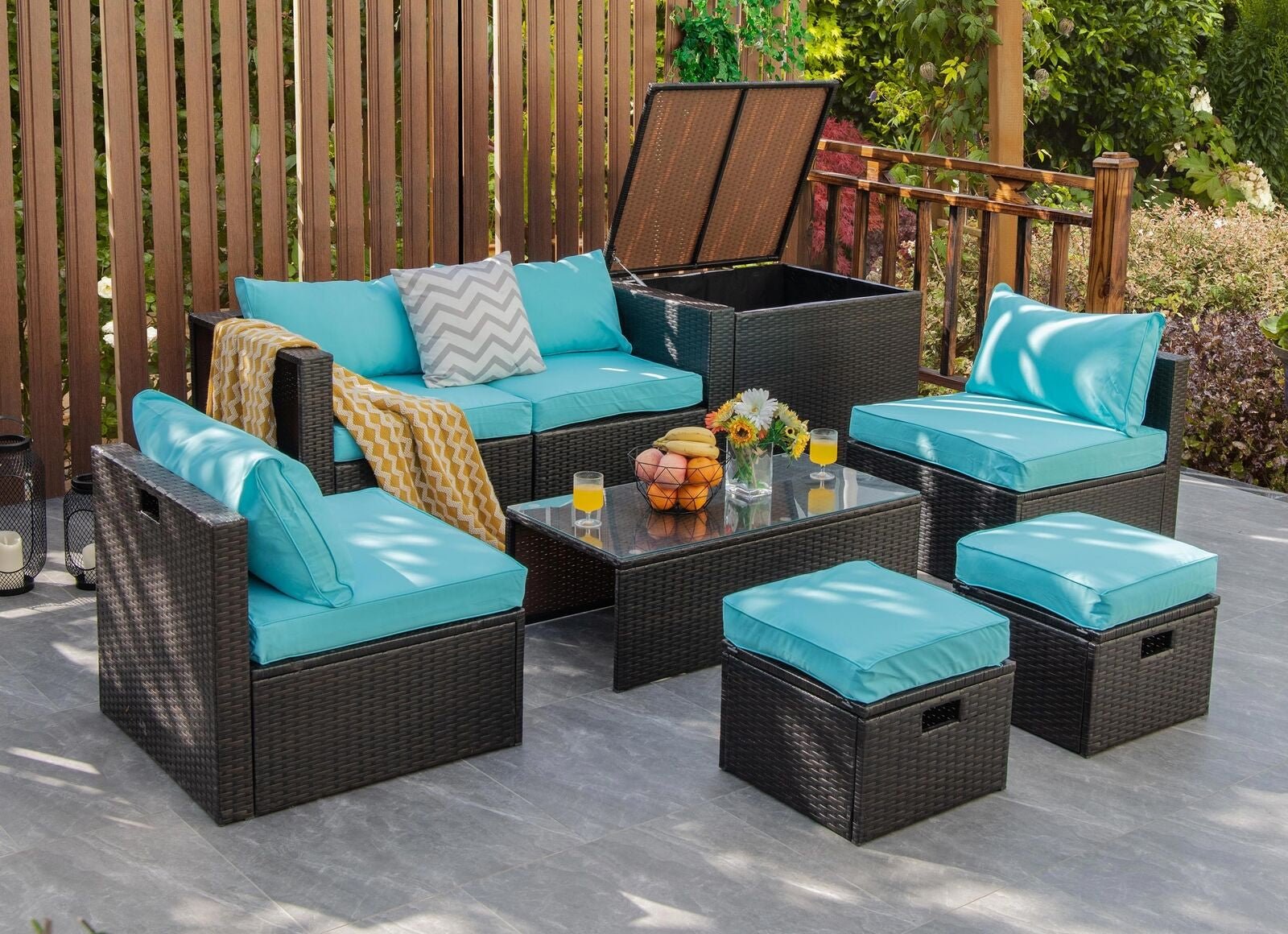 8 Pieces Patio Space-Saving Rattan Furniture Set with Storage Box and Waterproof Cover-Turquoise