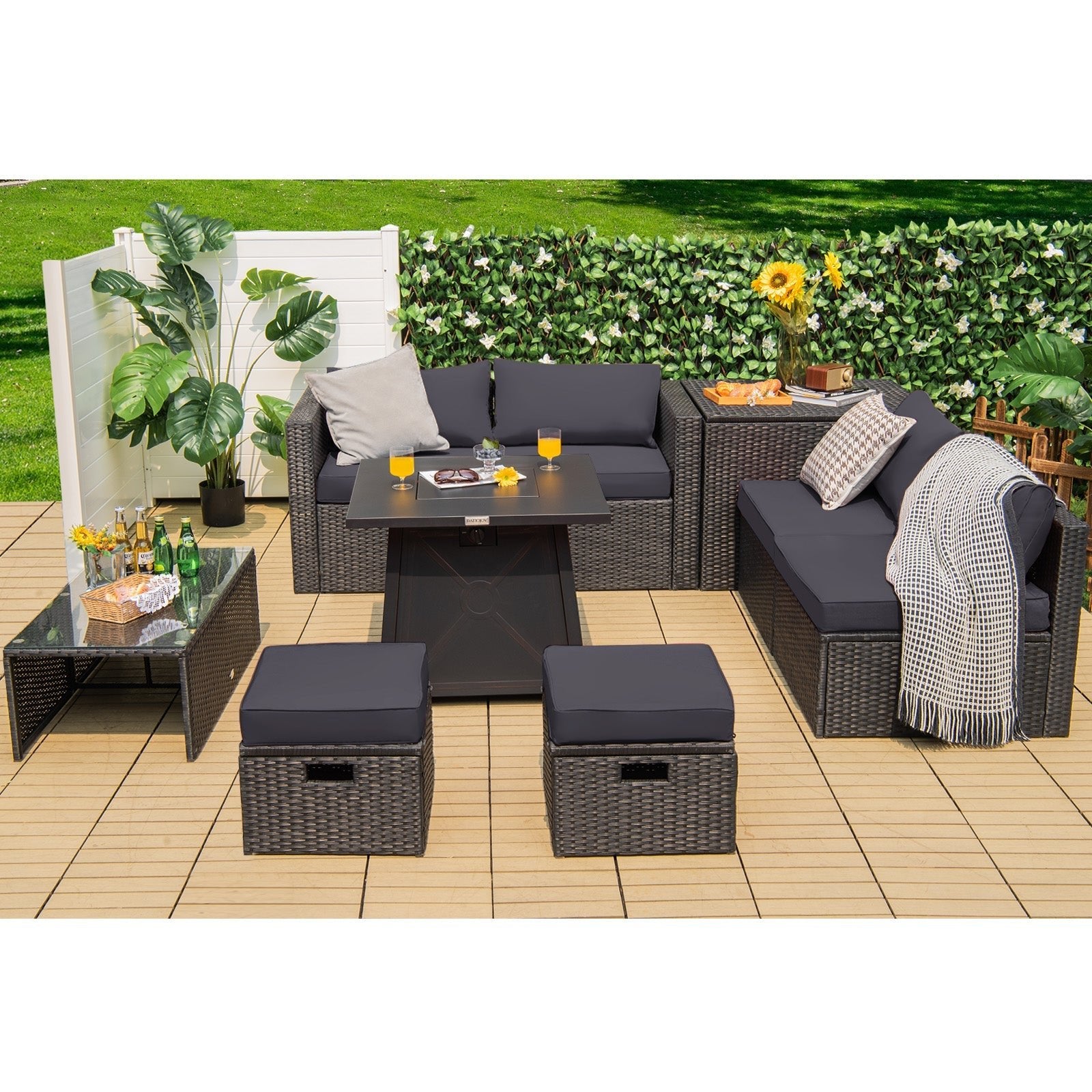 The 8-Piece Outdoor Wicker Patio Set with Fire Pit Table brings together comfort, functionality, and refined design to create a space that feels both inviting and elevated. With plush seating, integrated storage, and a beautifully designed fire feature, this collection transforms your patio into a true outdoor living experience.